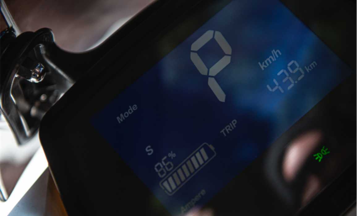 Tableau de bord : Affichage numérique LCD, compteur de vitesse monochrome, compte KM total et partiel. Indicateurs : charge restante de la batterie (graphique et pourcentage).